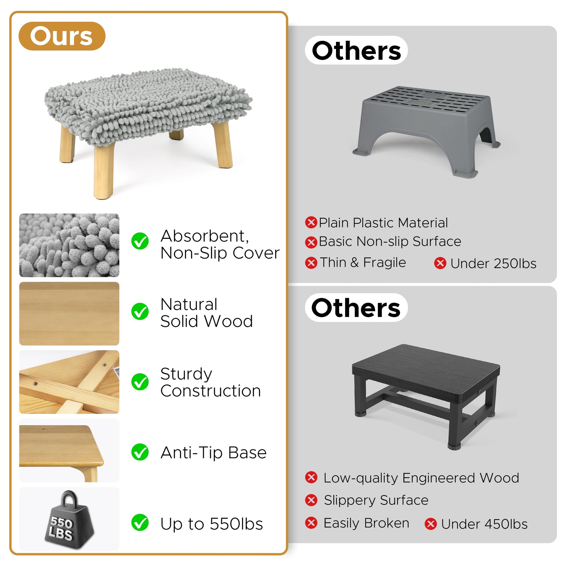 - [ High-Quality Materials ] The main part of 1 step stool is made of durable solid wood with a natural finish. The topper layer is a super absorbent bath mat that provides superior comfort.