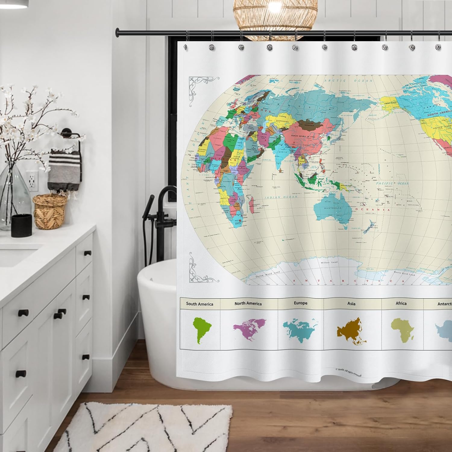 New! Map of The World with Detailed Major Cities. PVC Free, Non-Toxic and Odorless Water Repellent Fabric Shower Curtains - Large Home Decor Wall Map