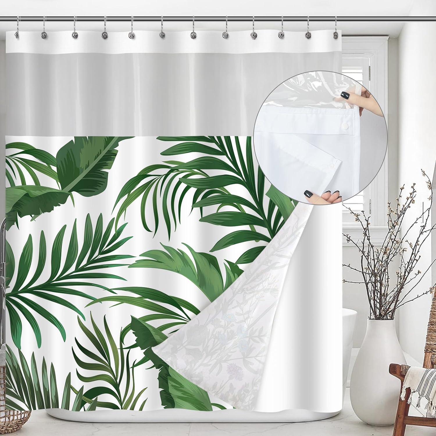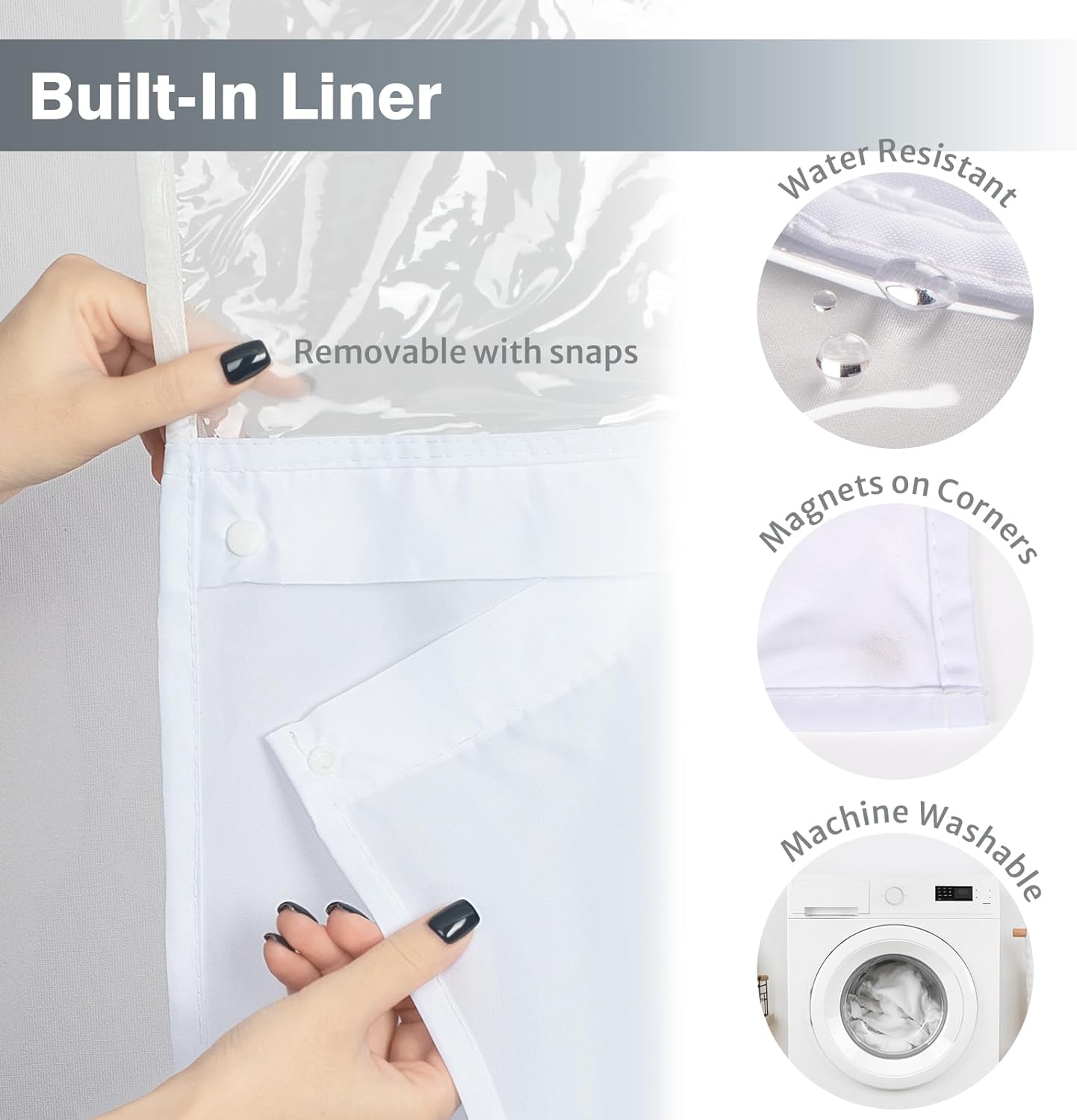 - [ Removable Inner Liner Design ] The snap-on/off fabric liner is easy for cleaning or replacement. You can remove the inside liner and replace it or wash it without taking down the whole curtain. There're 2 magnets in both bottom corners of the liner. The mesh up top lets in so much light and really opens up the shower space!