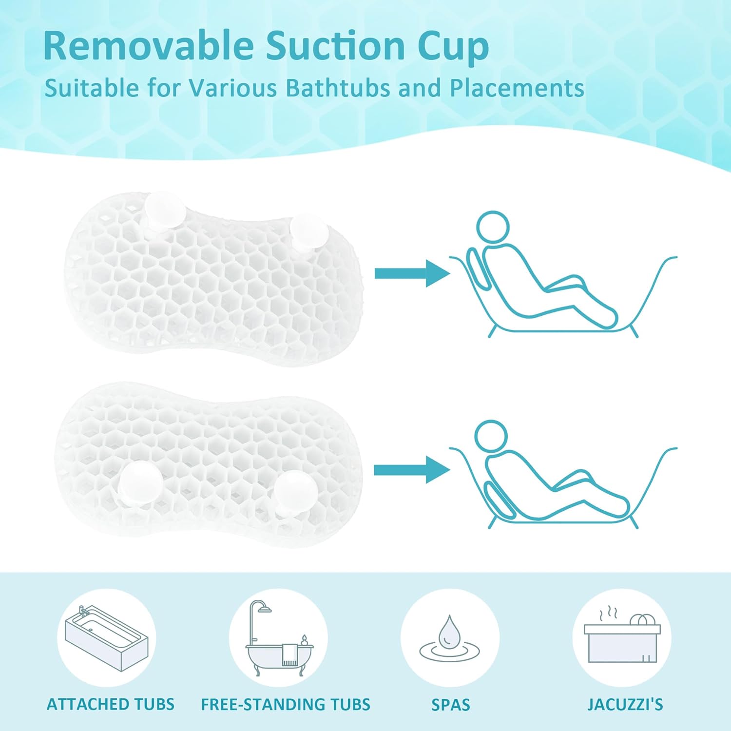 • [ How to Use ] The gift-able Bath Jello package consists of 1 x bath pillow and 2 x removable silicone suction cups. Before filling water in the tub, insert the provided suction cups into any chosen smaller cells of the pillow, and then stick them to the bathtub to secure position. You can always adjust the placement of the suction cups to help the bath pillow stay in the desired area of the bathtub. Warning! Avoid use of suction cups on uneven or textured surfaces.