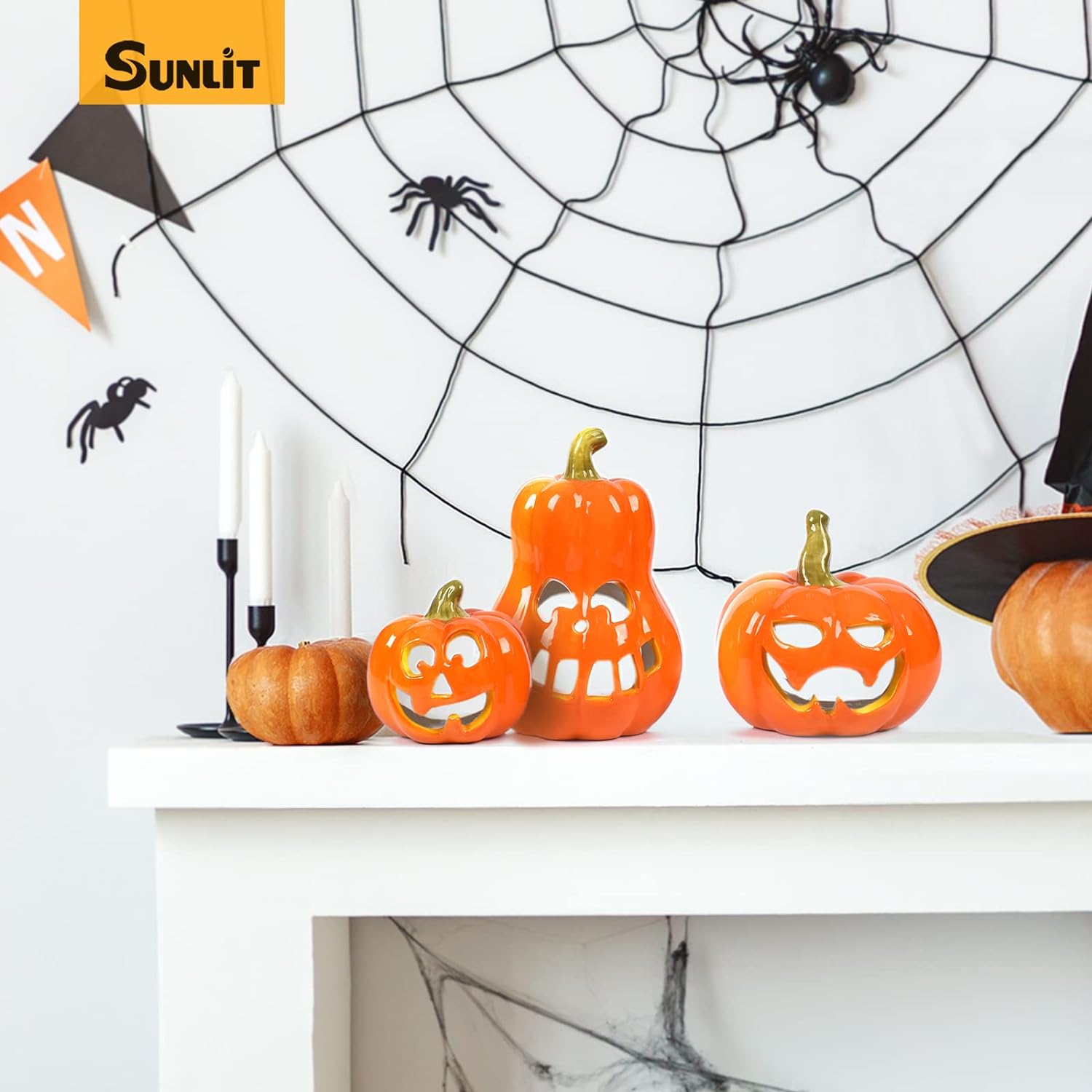 - [ Premium Quality ] Hand-painted and hand-carved to give an elegant touch as home decorations. This jack-o-lantern set is made of premium ceramic material, resistant to wear and heat for indoor and outdoor use. As a timeless decoration, it can be used years after years.