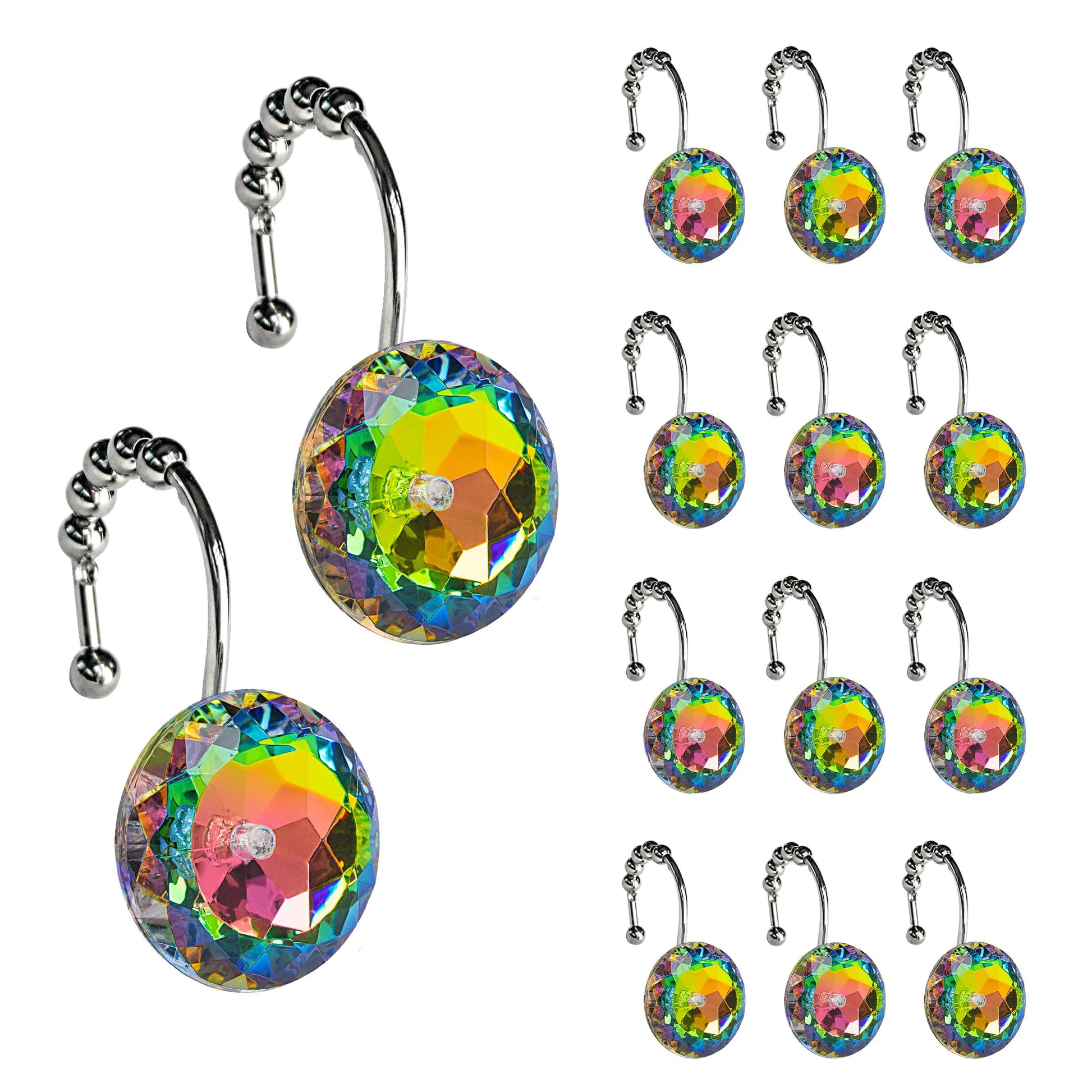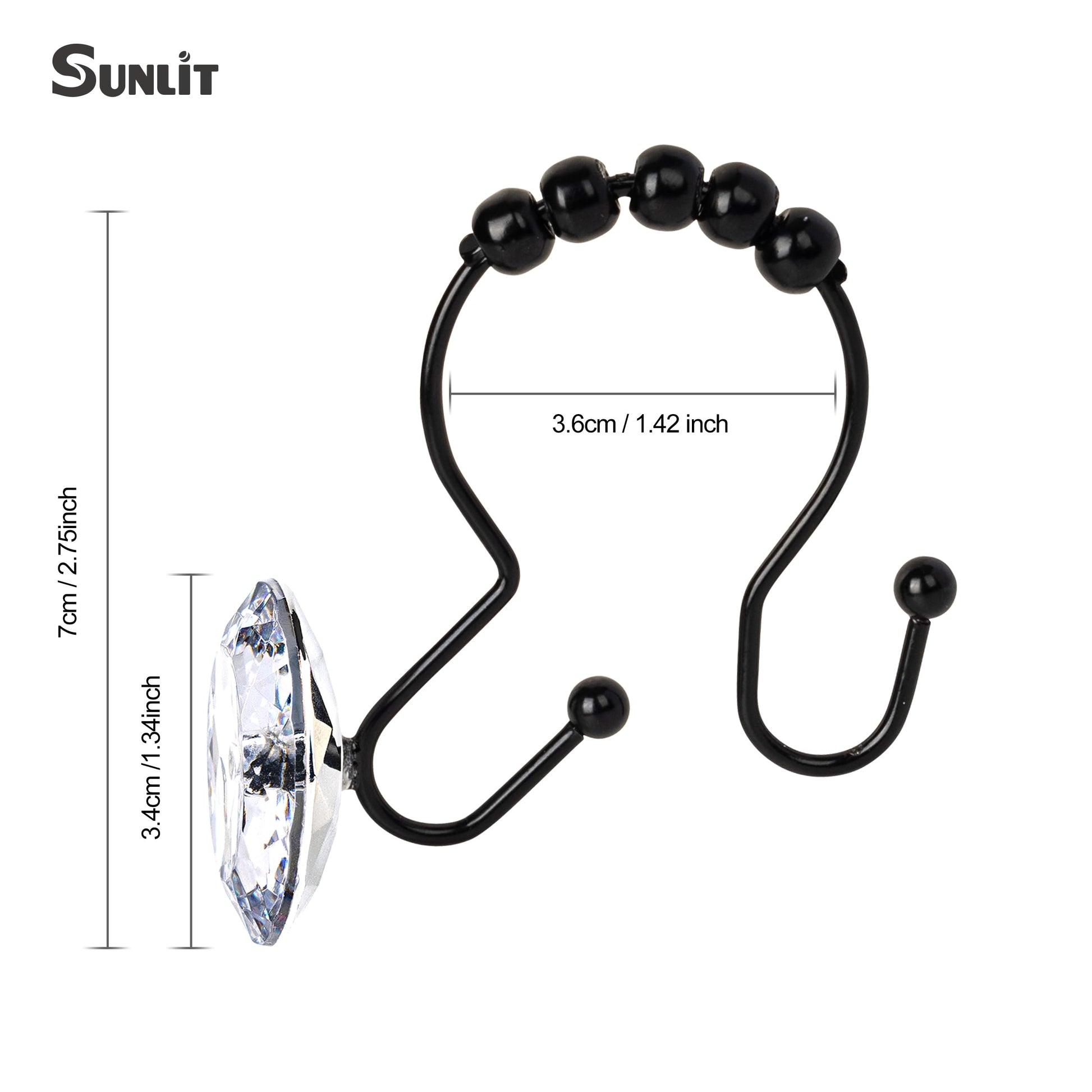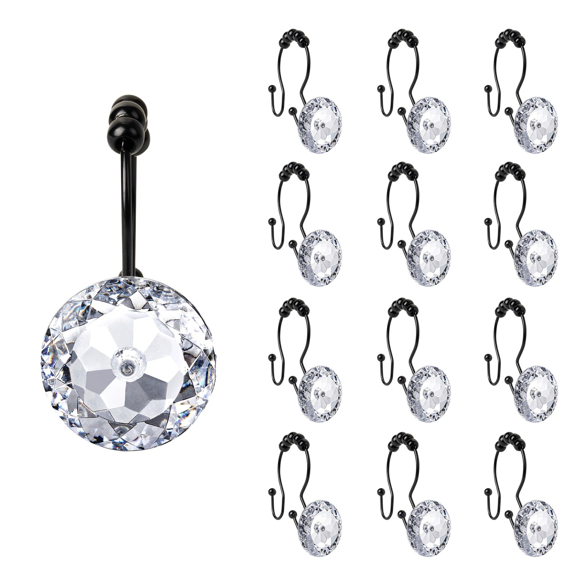 Sunlit Luxury Design Round Clear Diamond Crystal Gem Bling with Glide Balls Double Shower Curtain Hooks, Rust Proof Metal Rhinestones Glam Shower Curtain Rings-12 Pack