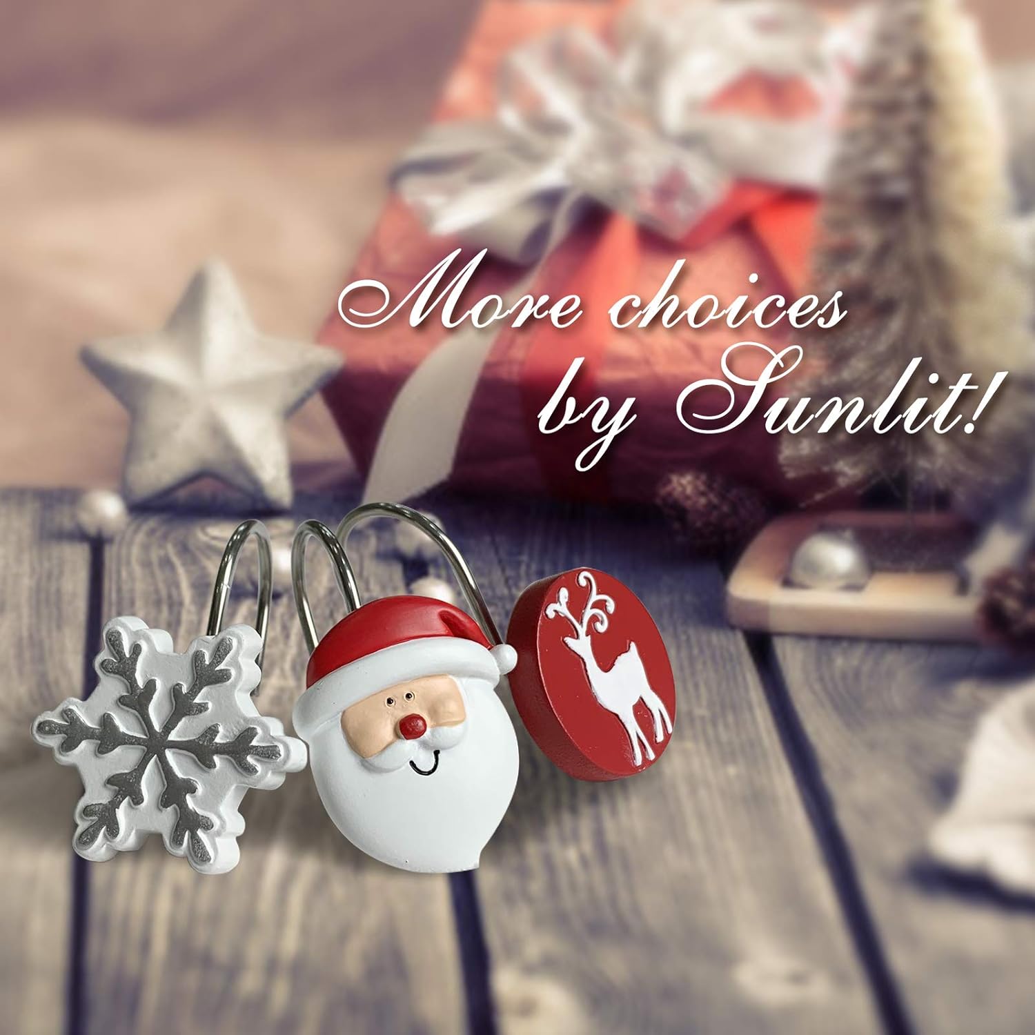 - The Sunlit Christmas Shower Curtain Hooks are made of stainless steel and Resin.
