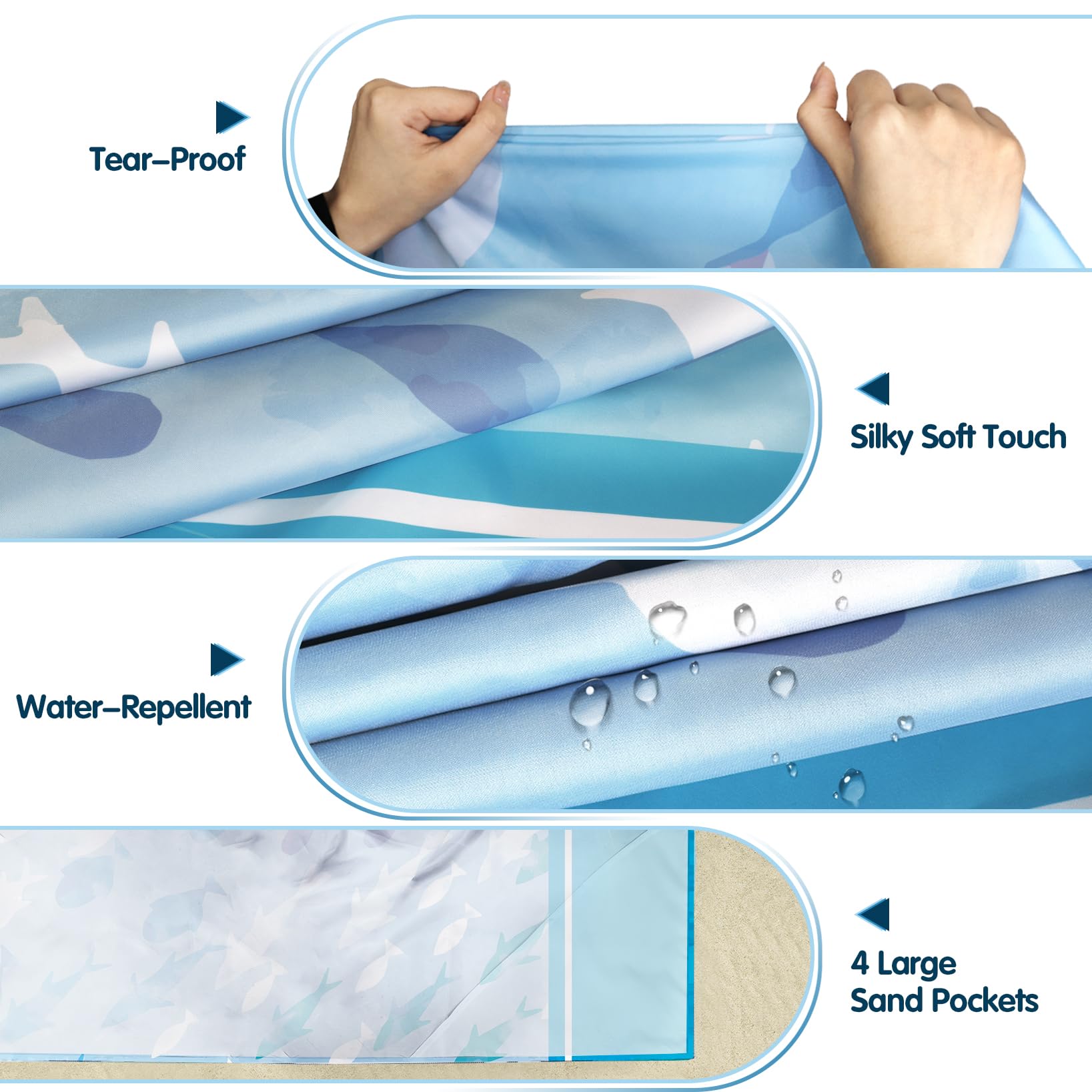 - [ Better Material, Skin-Friendly ] - Our beach blanket crafted from Cool Soft Fabric ensures comfortable lounging without skin irritation. Easily cleanable, simply brush off sand effortlessly! Constructed with sand-resistant, water-repellent, and odorless fabrics, eliminating the need for drying after a beach visit.