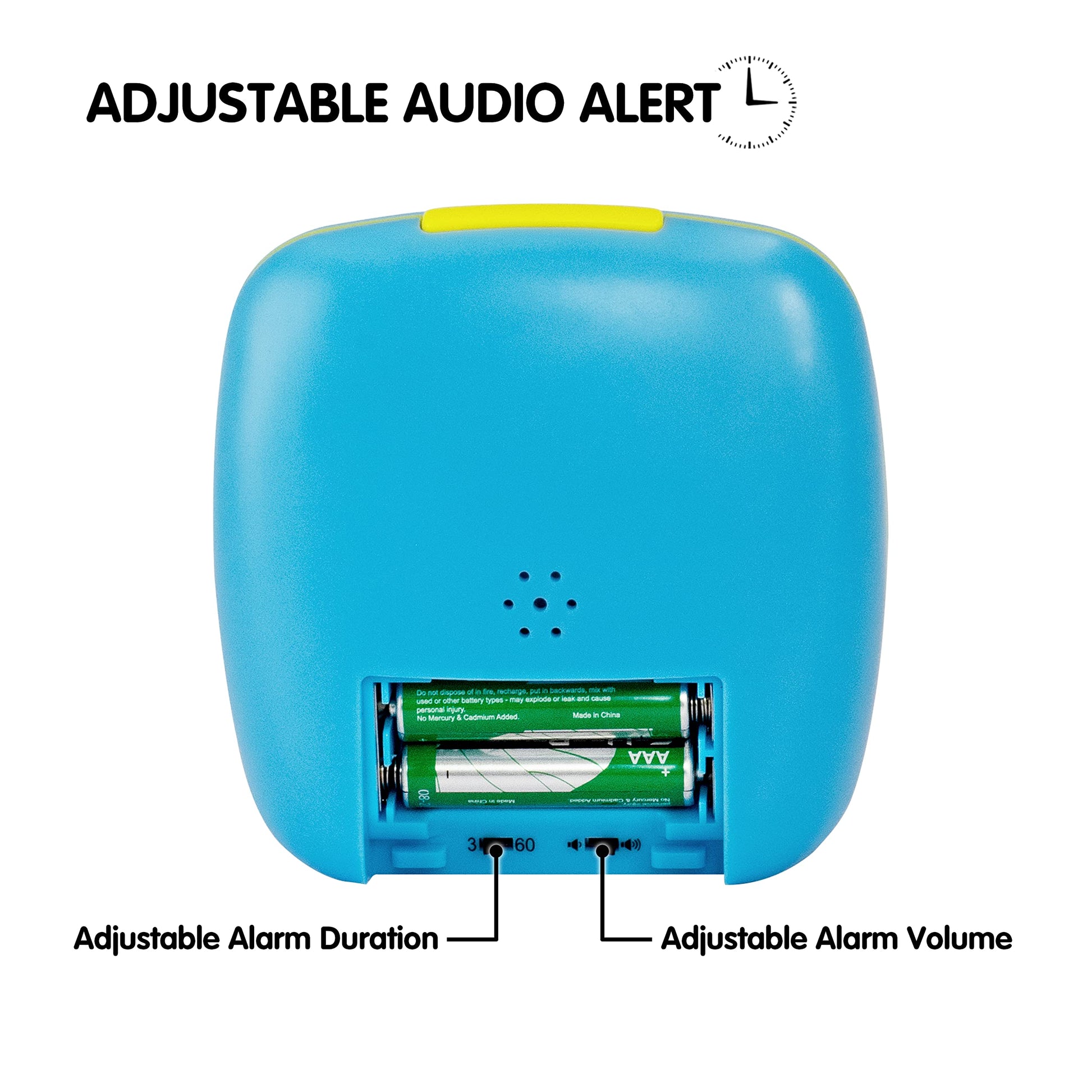 - [ Adjustable Audio Alerts with Alarm Stop Button ] Volume and duration of the alarm are both adjustable: 3 seconds or 60 seconds for alert duration, low or loud for alert volume. You could push the top button to stop the alarm. The timer does not audibly tick, allowing you to focus on your tasks.